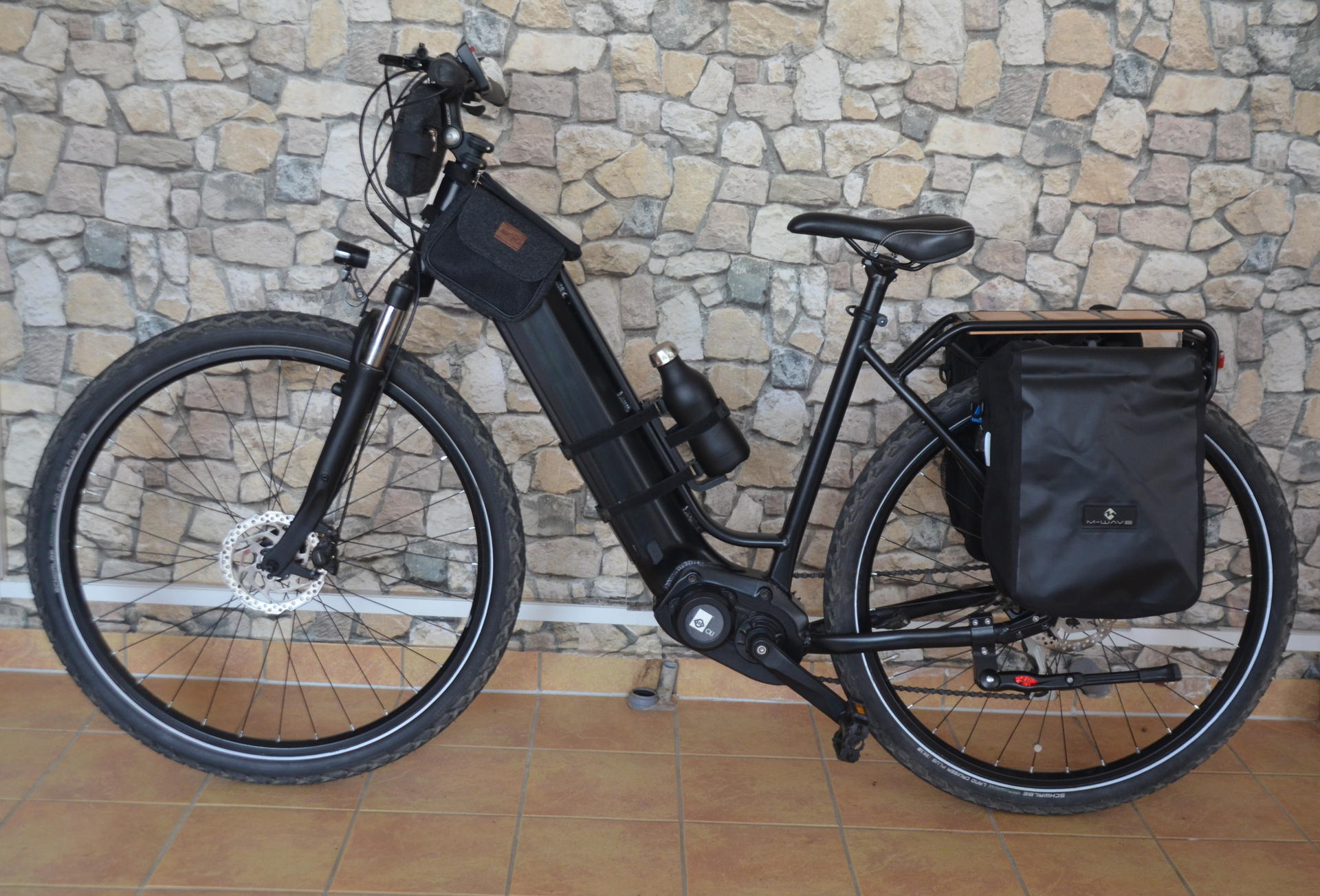 Das Mechane EOS mit dem "BE"-Paket, auch mal bereit für die schnelle Abendrunde ohne Lenkertasche, Rahmentasche mit Smartphone-Fach und den 2 Hecktaschen, sowie der hochwertigen Dowabo-Trinkflasche (Isolierflasche, mit dem passenden Dowabo-Bikehalter, gegen Aufpreis) . Natürlich werden aber auch der EOS-typische Holzmittelrahmen mit herausnehmbarer Tasche und die Schutzbleche vorne und hinten demontiert mitgeliefert.